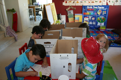 On the second day, we have art. For art we did the first part on a project that is a secret. It is supposed to be a gift for both Mom and Dad. Mother's Day is in May, but unfortunately Father's Day is on a day when we aren't here. I am going to combine Mother's Day and Father's Day and turn it into Parent Appreciation Day. I want to plan something special and the art that the children did this week is a gift to the parents. I took pictures of the children painting, but blurred out the project.